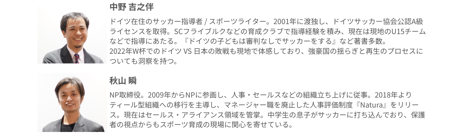 「答えを教えない」指導で子供たちの主体性を引き出す中野さんと、社員の自律を促すNP取締役の秋山瞬。 ドイツのグラウンドと日本のオフィス。環境は違えど、「人を信じて任せる」という共通のテーマに向き合う二人の哲学をお届けします。